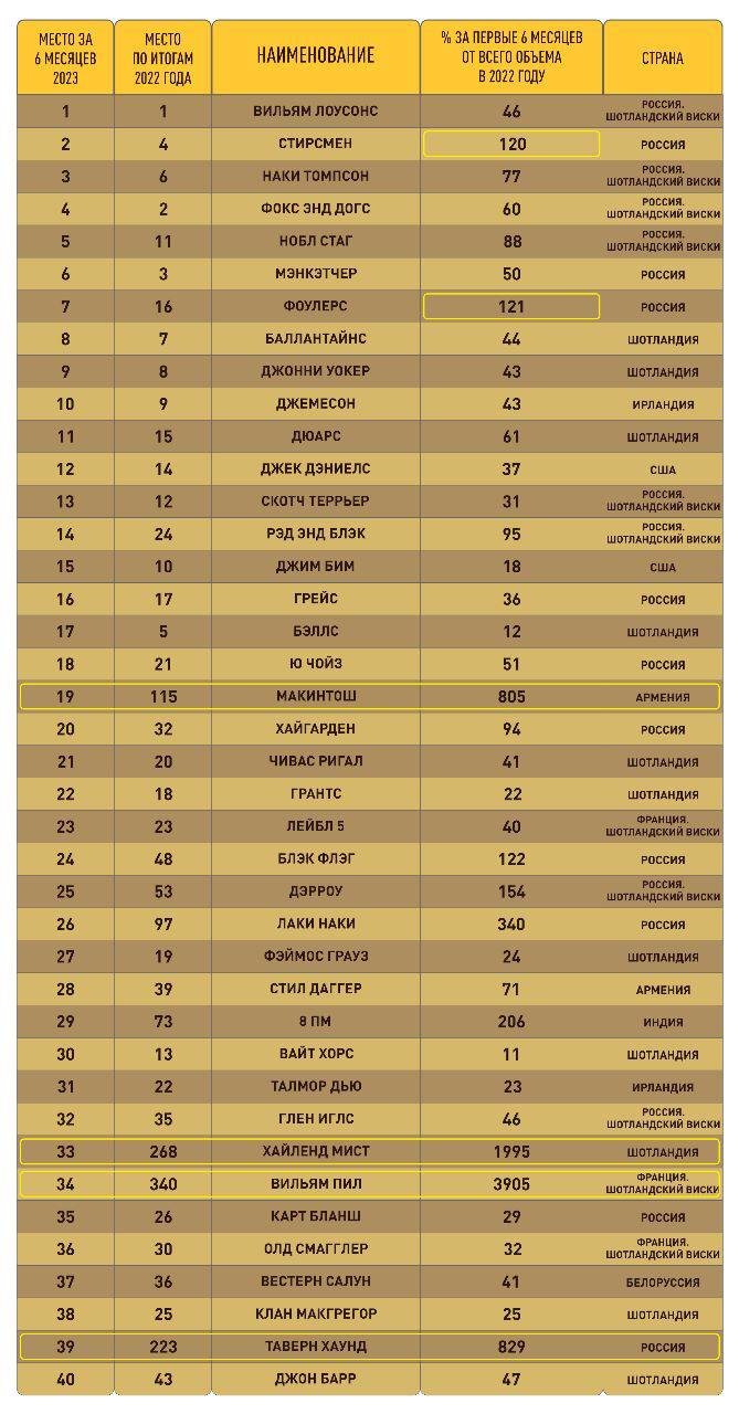Первые 6 марок рейтинга — это половина всех продаж виски в России в этом году. Импортные напитки серьезно уступил место локальному розливу. По общим цифрам мы не видим падения объемов, но ключевой особенностью стало серьезное изменение структуры категории. Появились как новые марки, так и новые страны поставщики – Армения, Белоруссия, Индия и Китай.