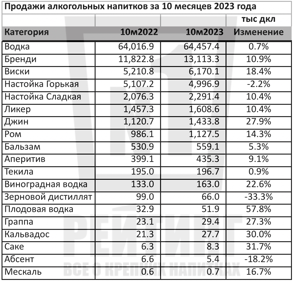 За 10-месячный период 2023 года статистика продаж указывает на сохранение трендов в большинстве категорий рынка алкогольных напитков. Отдельное внимание заслуживает увеличение продаж коньяка, на фоне сообщений о массовых «признаках фальсификации» и дефиците сырья. Видим повышение продаж в категории виски, что совпадает с ростом кол-ва новых для нас напитков, в большинстве своем без указания происхождения сырья и условий выдержки.