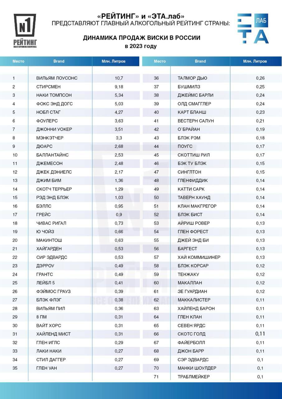 Параллельный импорт позволил уважаемым брендам Джонни Уокер, Дюарс и Баллантайнс остаться в первой десятке, но будут ли эти марки в верхней части таблицы по итогам 2024 года пока большой вопрос. В целом потребление импортного виски снизилось практически вдвое, но за счет уменьшения общего ассортимента. Самые известные марки сохранили объемы продаж.
