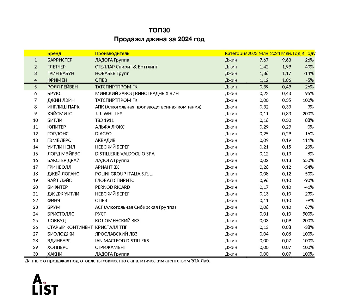 Лидер в тридцатке лучших по продажам остается неизменным и уже привычным – джин БАРРИСТЕР. С большим отрывом от остальных напитков и показателем прироста в литрах, превышающим продажи следующего по продажам бренда. Компания "Ладога" активно расширяет ассортимент, создавая премиальные джины и экспериментируя с весьма оригинальными ингредиентами, такими как водоросли и красные перцы. Для потребителя важно, что этот джин доступен не только по цене, но и географически: он продается в каждом городе и районе нашей страны, а теперь уже и за ее пределами. Мне нравится, что он изначально схож с импортными марками классического джина, такими как Бифитер, Гордонс и Бомбей, которые были у нас в продаже, пока в 2017 году не появился Барристер. Всего за два года компания вывела его на первую строчку продаж.