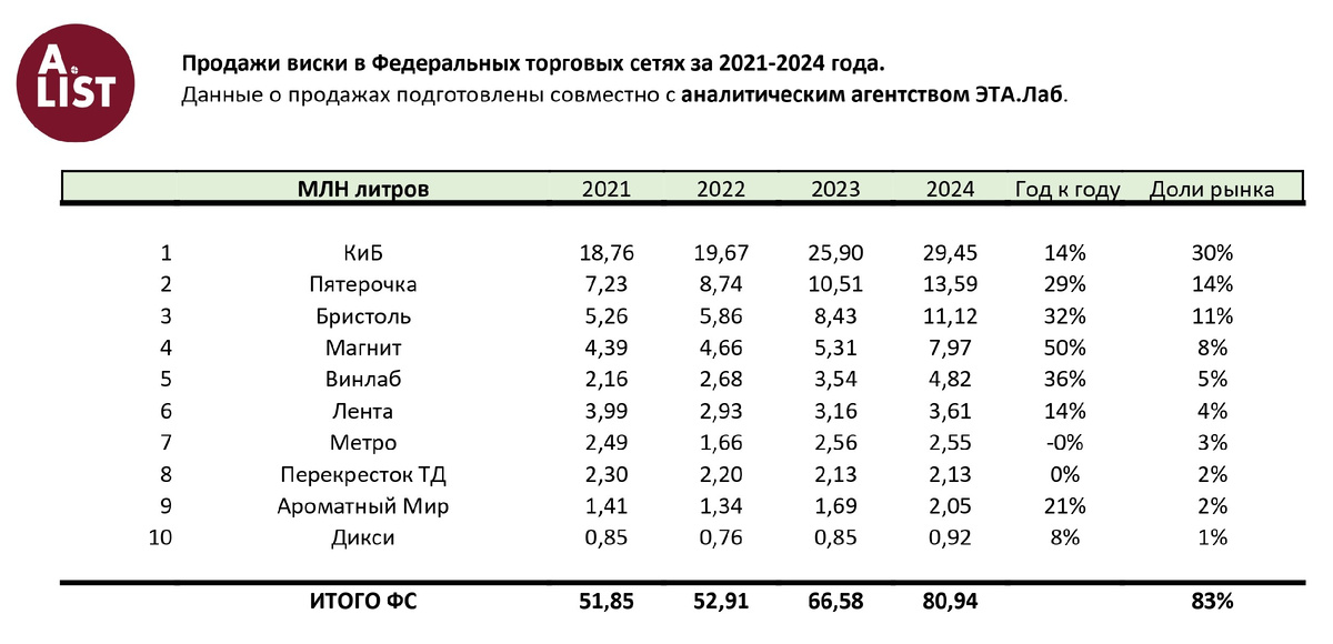 В настоящее время четыре торговые сети — "Красное и Белое", "Пятерочка", "Магнит" и "Бристоль" — с большим отрывом лидируют по продажам всех категорий крепких напитков, лишь меняясь местами друг с другом.