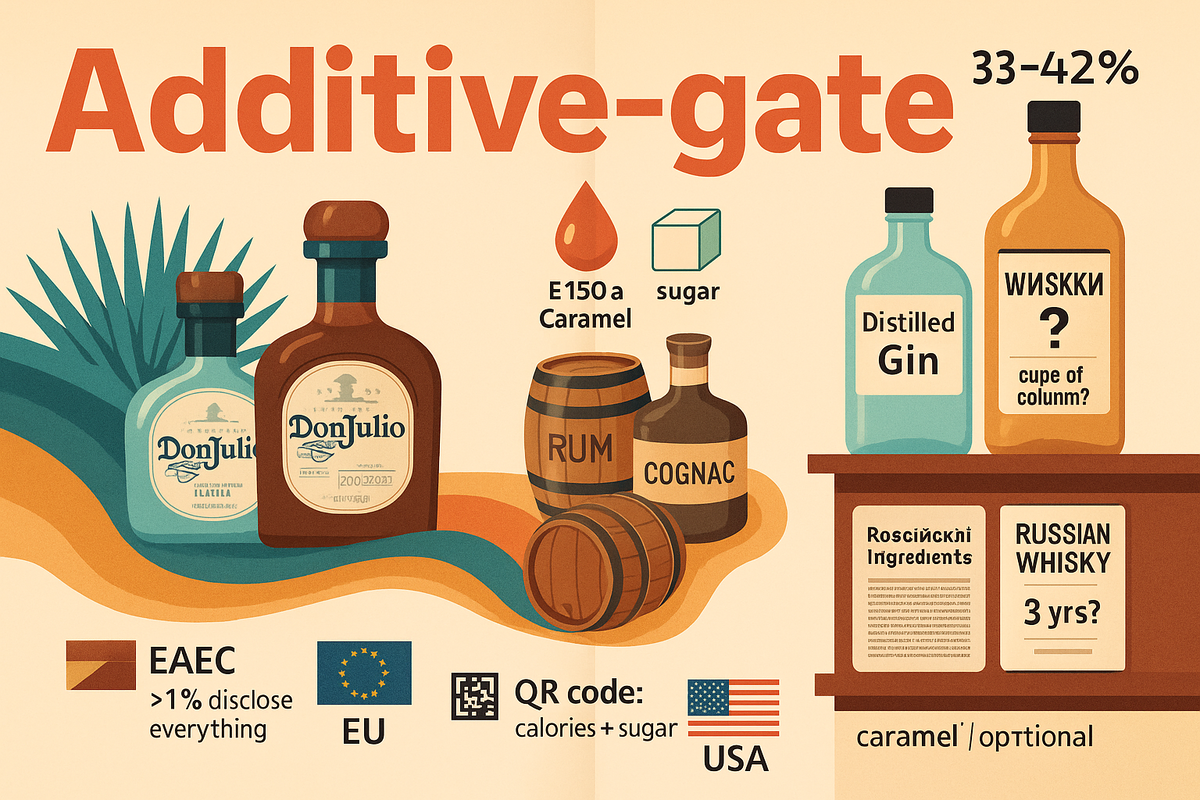 Всё началось, когда в США подали коллективный иск против Diageo: потребители обвинили «Don Julio» и «Casamigos» в том, что заявленный статус 100 % blue agave прикрывает фактические 33–42 % спирта агавы. Одновременно мексиканский регулятор CRT заморозил право брендов выводить на этикетку термин additivefree и затеял процесс против некоммерческого Additive Free Alliance, чтобы получить эксклюзив на право такой маркировки. Но спор о «чистоте» текилы сегодня уже вышел за пределы agave категории и добрался до каждого напитка, где карамель, глицерин или «дубовый экстракт» давно считаются «традицией».