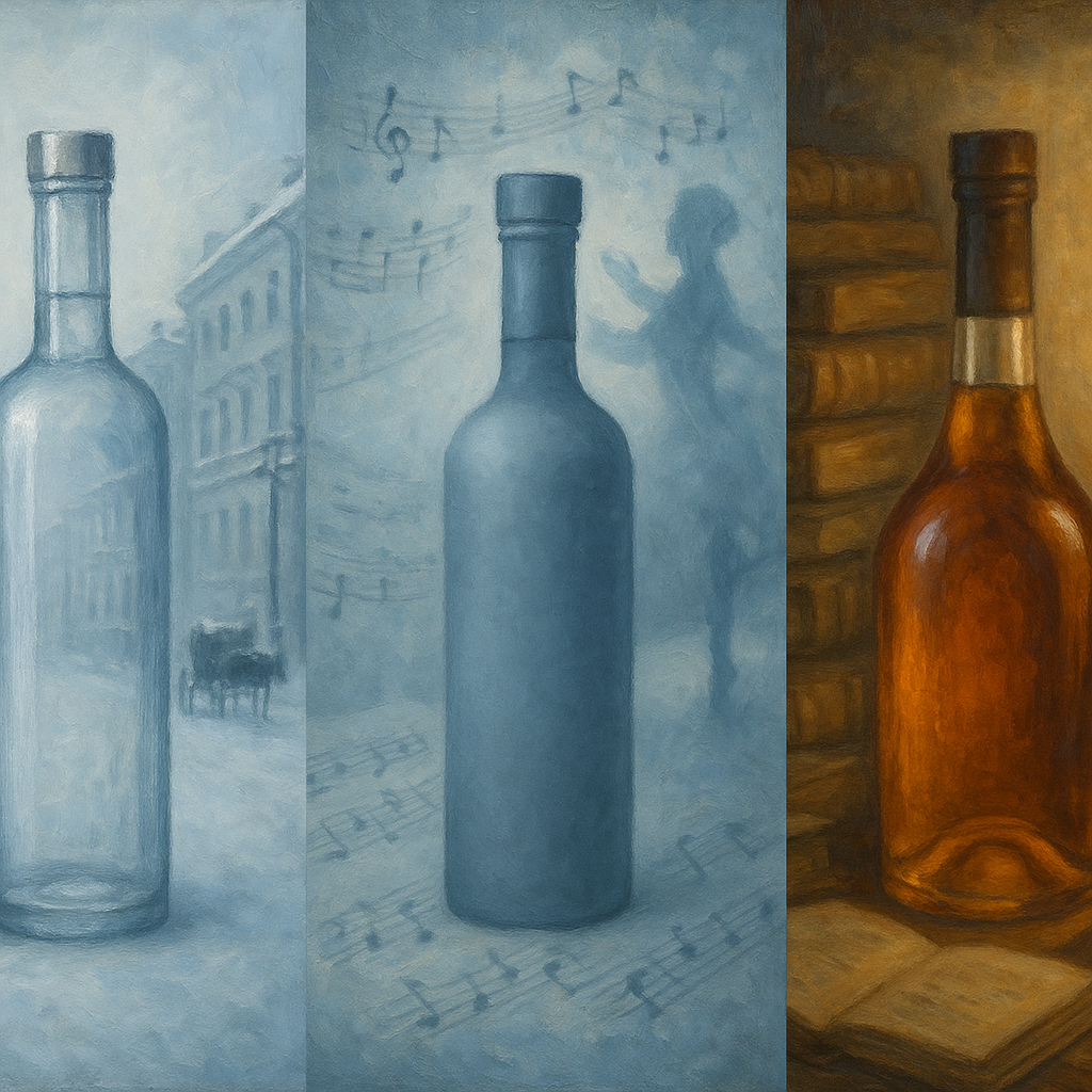 Водка «Чайковский» оформлена как культурный экспортный образ России — строго, визуально «дороже своей цены». Имя композитора подано нейтрально, без портрета.