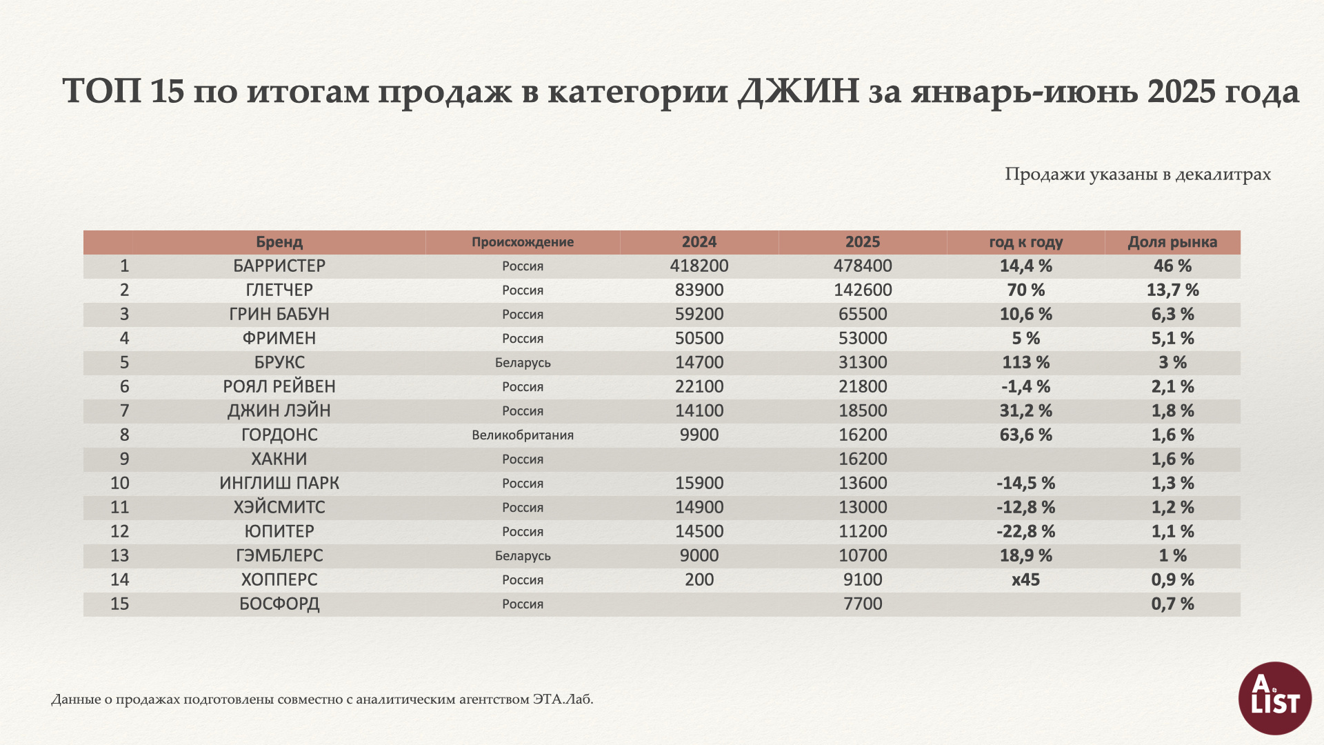 Шесть из десяти бутылок приходятся на пятёрку лидеров; первые пятнадцать брендов совокупно формируют 86 % продаж. Остальные сотни марок делят между собой чуть больше 1 млн л. и редко переходят отметку в 5 тыс. л за полгода. Рынок рома предельно олигополизирован.