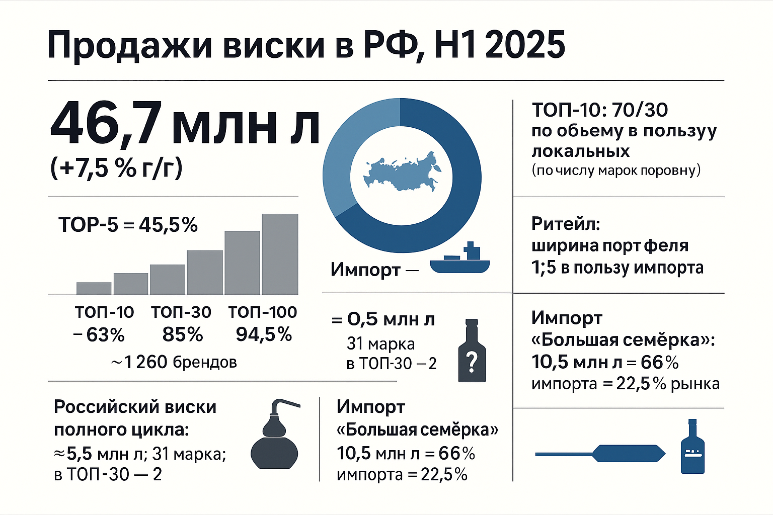 Драйверы роста — локальные бренды, включая напитки, которые не указывают происхождение виски и российский виски полного цикла, как и в прошлом году. Импорт удержал долю рынка только ключевыми брендами и широтой портфеля.