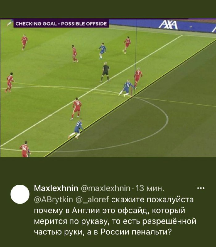 Граница руки и плеча так же определяется «основанием подмышки» (bottom of the armpit). Эта же граница будет проходить по Правилу Вне игры – плечом можно забить, значит попадание плеча во вне игры – нарушение Правил.