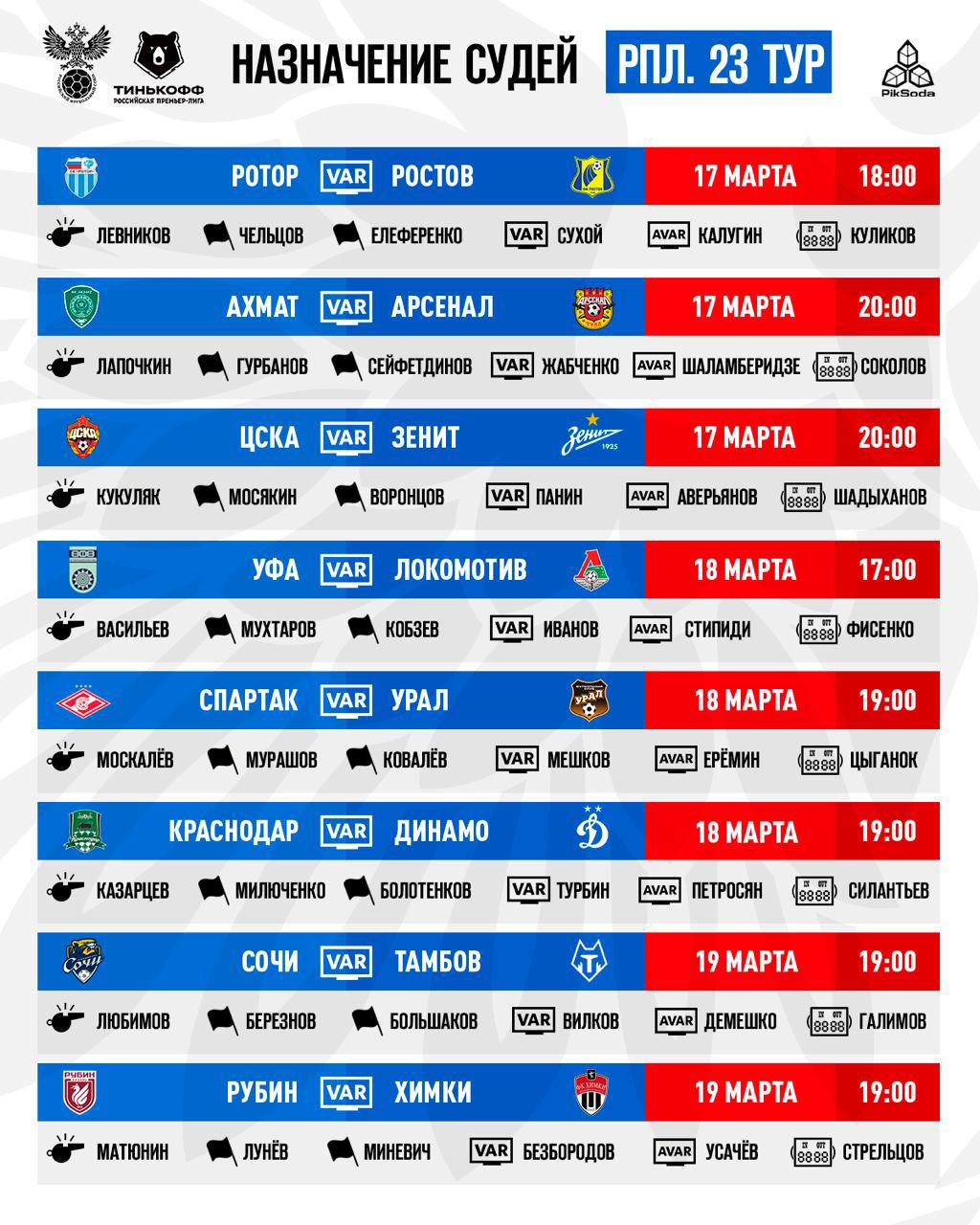 Любимов после не самой лучшей дебютной игры проведет дежурный матч «Сочи» - «Тамбов». Назначение Лапочкина на «Ахмат» - «Арсенал» говорит о том, что пенальти на Мирзове и непенальти на Полозе – верные решения.