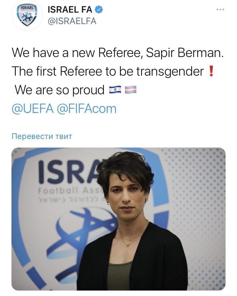 Сапир стала первым в мире арбитром, сменившим пол - и израильская федерация футбола похвасталась этим в твиттере. В комментариях на спортсе люди уже удивляются - а чему тут вообще гордиться? Разве от смены половых органов мадам станет лучше судить?