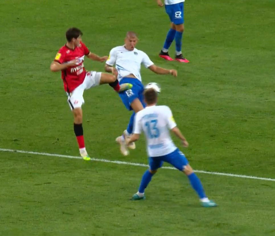 Безрассудное поведение на фото. Попадает шипами в бедро. Должна быть желтая карточка Бакаеву. 28 минута.