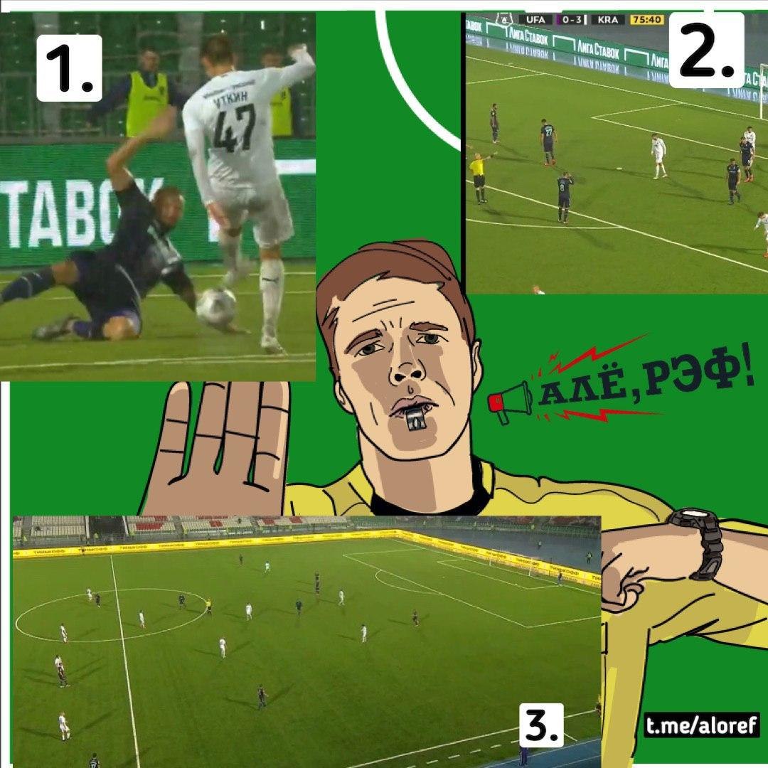 Я это всё веду к одному эпизоду из матча «Уфа» - «Краснодар». 75 минута, счёт 0-3. Уткин бьет по воротам (1 - на картинке), мяч попадает в опорную руку защитника (левую, а то некоторые акцентировали внимание на правой руке и говорили, что это пропуск пенальти и оценка 7,8; откуда столько злости и желчи, Игорь? Посмотрите эпизод ещё в замедленном повторе). Дальше происходит следующее: Карасёв видит попадания мяча в руку и назначает угловой (2). Никто на это не обращает внимание, где-то издалека слышен выкрик «рука», Карасёв назначает удар от ворот (3).