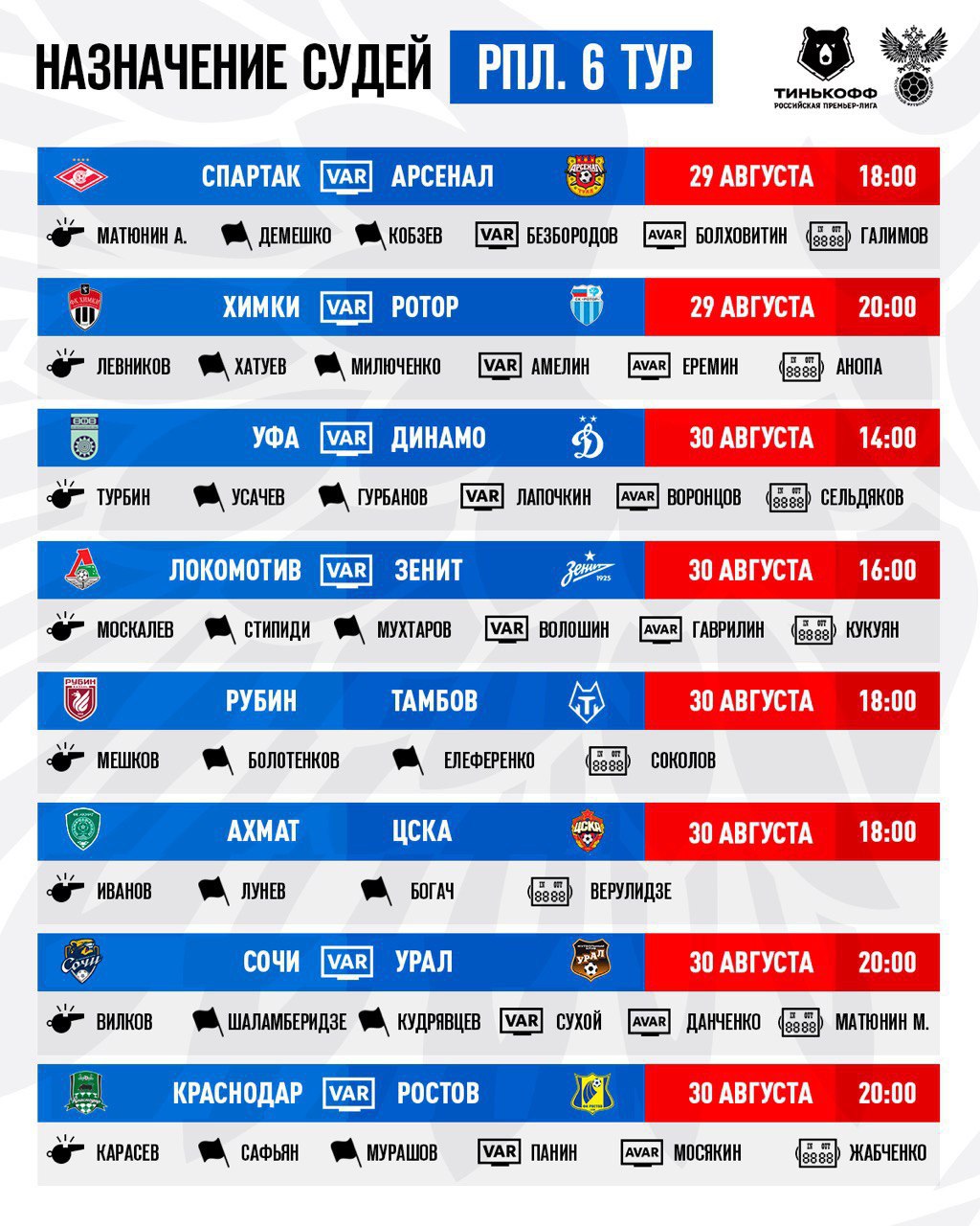 Назначения на 6 тур на картинке. Из судей отдыхает только Васильев, остальные заняты либо в поле, либо на ВАР. По 4-й игре из 6 возможных получили Левников, Карасев, Матюнин, Иванов. Вернулись Турбин и Мешков. Москвич Матюнин будет судить «Спартак». Как всегда, будет давление. Турбин поедет в «Уфу»: к Евсееву ездить непросто. Москалев (неожиданно) на матче «Локо» - «Зенит». Карасев отправляется судить южное дерби – «Краснодар» - «Ростов». Всем бригадам желаю хорошо отработать на матчах.
