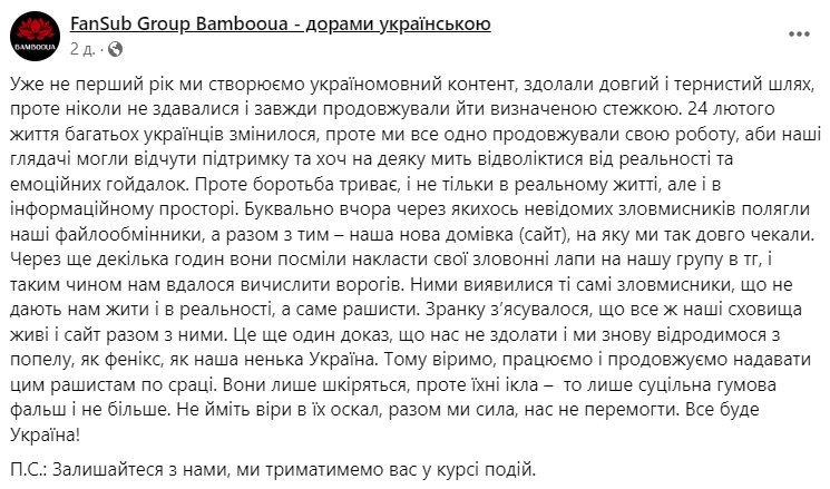 Якась кацапня заблокувала ТГ-канал команди перекладів дорам BambooUA, а також ледь не поклала сайт та файлообмінник. Та ніщо не спинить український контент! 💪