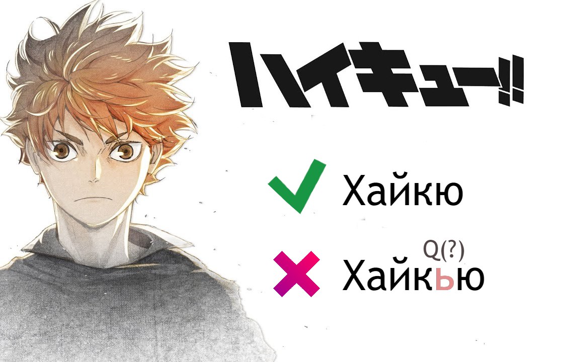 Хайкю: взялося з уже застарілого слова, яким колись позначали волейбол, 排球 (haikyuu). Як ви бачите, записане воно ієрогліфами. Автор Фурудате Харуічі таким чином просто актуалізував старе слово, записавши його катаканою.