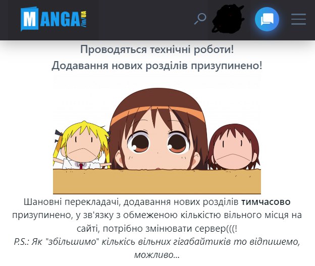 На manga.in.ua тимчасово відсутня можливість додавання нових розділів через обмаль вільного місця на сервері.