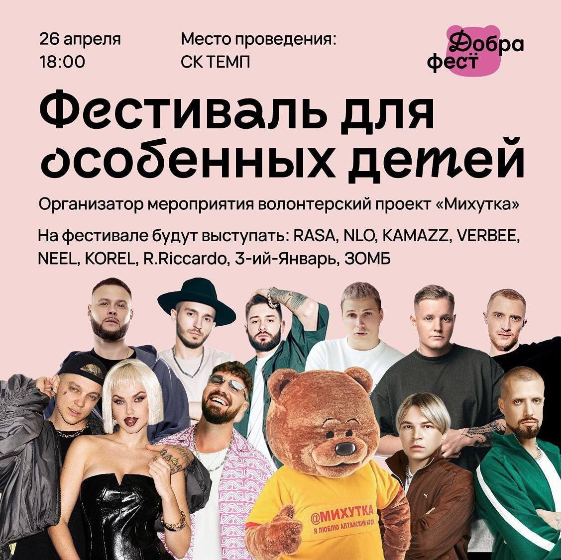 Благотворительный концерт для детей с ограниченными возможностями здоровья пройдет 26 апреля в СК "Темп". На сцене выступят: RASA и NLO, КАМАZZ, VERBEE, NEEL, KOREL, R.Riccardo, 3-ий-Январь и ЗОМБ!