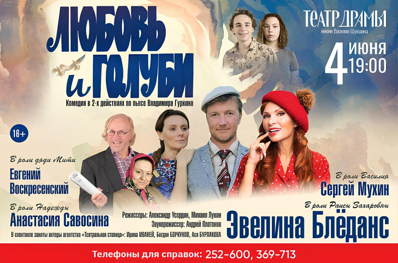 4 июня в театре драмы в Барнауле покажут легендарный спектакль "Любовь и голуби" с участием Эвелины Бледанс и других звезд.