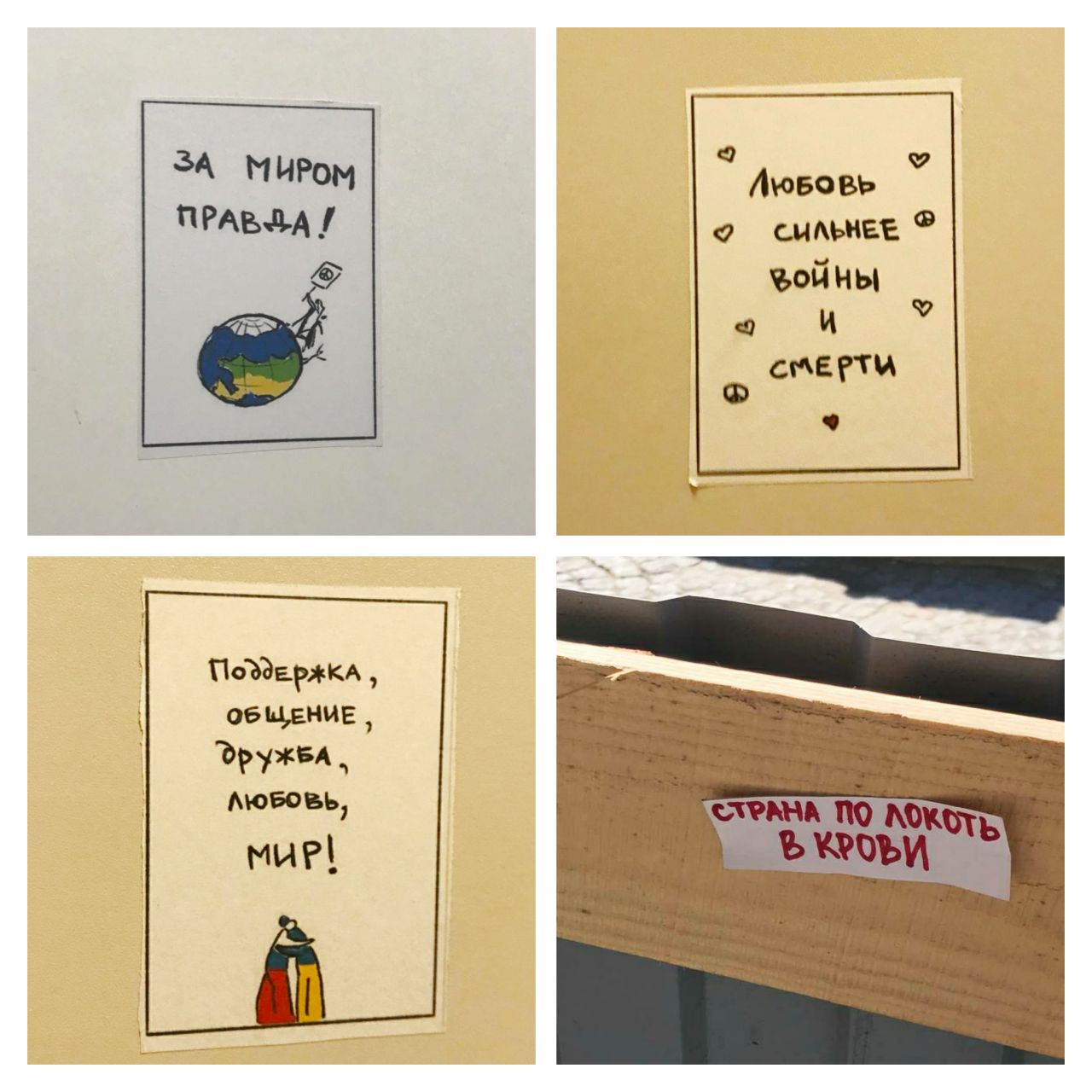 «Несмотря на то, что учеба почти завершилась, в стенах университета продолжается агитация против войны. Стикеры с рисунками Саши Скочиленко расклеиваются в кабинках туалетов и на других доступных местах.