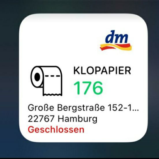Один товарищ в интернетах разработал виджет, столь необходимый добропорядочному бюргеру в эти неспокойные времена: этот виджет показывает, сколько туалетной бумаги осталось в ближайшем к вам филиале dm.