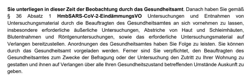 Служба здравоохранения шлёт поэзию: "Вы находитесь под нашим наблюдением. Согласно постановлению (с лаконичным названием - прим. Апп.гамб.) HmbSARS-CoV-2-EindämmerungsVO вы обязаны по требованию предоставить нам возможность собрать свой биоматериал в виде мазков с кожи и слизистых, крови или рентгеновских снимков. Вы также обязаны пустить нас в своё жилище для опросов и проверок (лол что - прим. Апп.гамб.)".