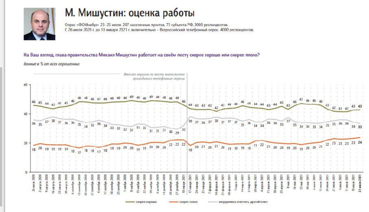 Впрочем, если посмотреть на результаты последнего опроса ФОМ можно увидеть, что колебание рейтинга доверия Мишустину критично только в период с 6 декабря по 27 июня 2021 года: с 49% опрошенных, одобряющих действия председателя, до 41%. Дальнейшее снижение показателей может быть весьма закономерно в связи с ожиданиями россиян от нового правительства перемен или активной поддержки.