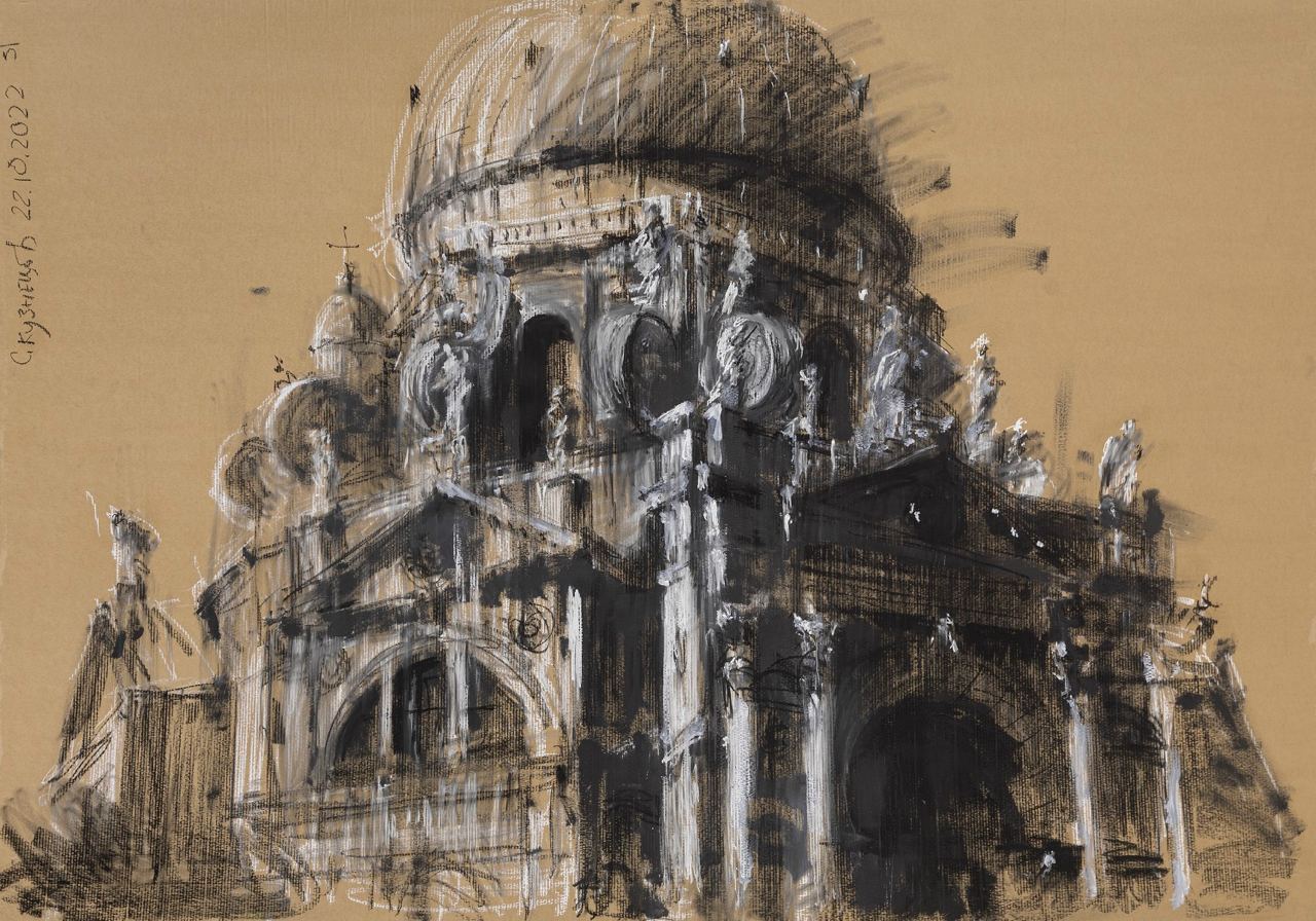 В новой графической серии художник и архитектор Сергей Кузнецов продолжает развивать традиционные для себя темы. Центральное место в его работах занимают образы зданий и публичных пространств России и зарубежья — Москвы, Санкт-Петербурга, Венеции, Рима и других городов. На выставке можно увидеть зарисовки и безымянного здания в Новосибирске, и купола Дома компании «Зингер», и стамбульской мечети.