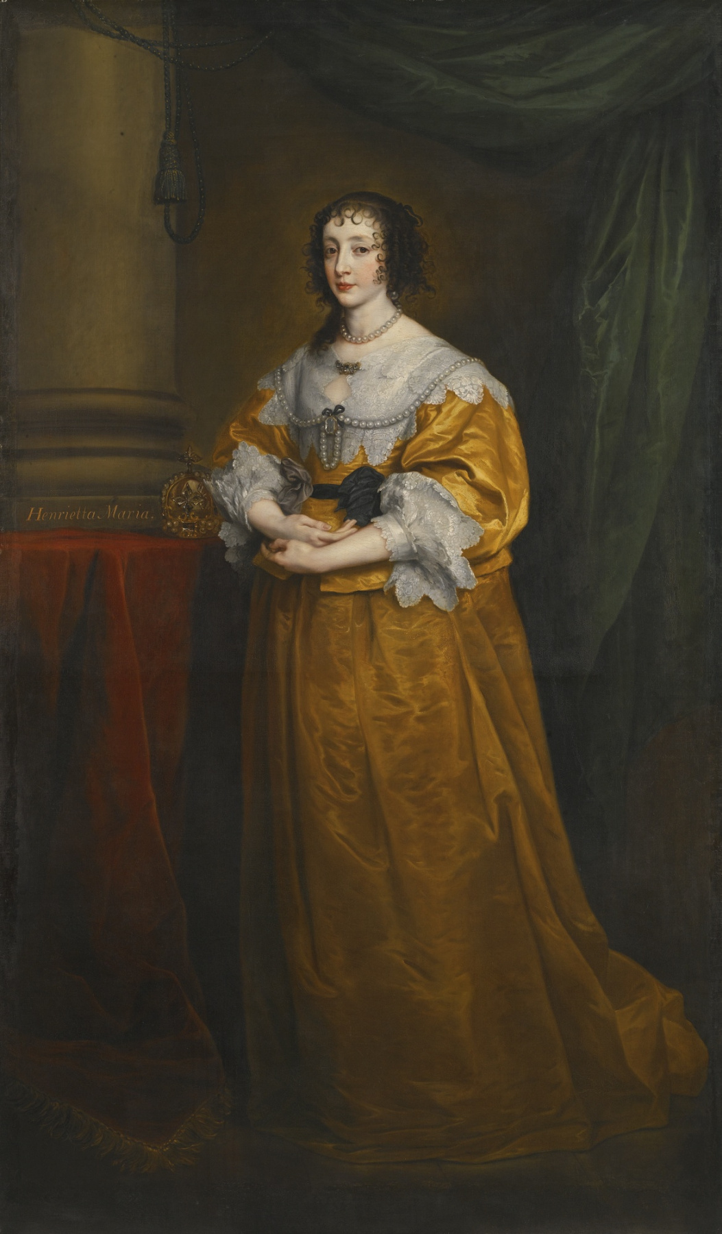 Королева предстаёт перед зрителем в элегантном простом шафраново-жёлтом платье с широким кружевным воротником и манжетами. В её взгляде и позе отсутствует высокомерие, несмотря на статус; единственный намёк на высокое положение – маленькая королевская корона на столе слева. Положение рук Генриетты Марии чуть ниже талии ладонями вверх, одна поверх другой, предполагает, что она ждёт шестого ребёнка – принцессу Анну.