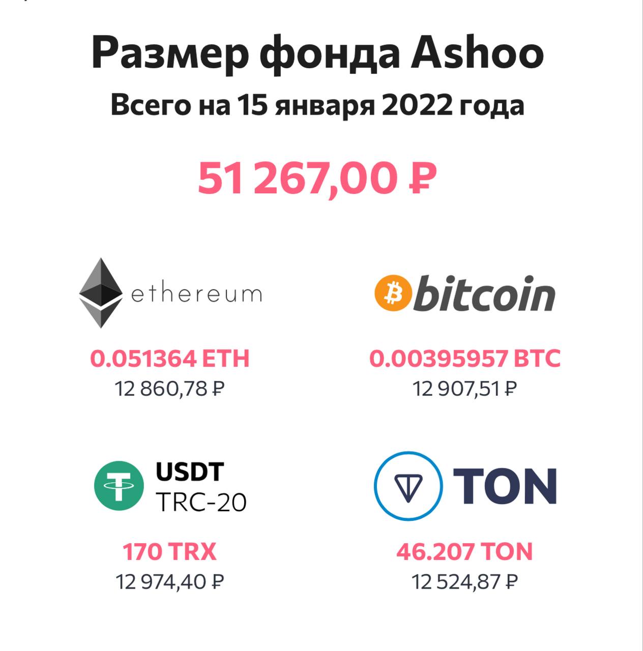 Более подробная информация о состоянии Фонда доступна по ссылке - https://ashoo.cc/fond-ashoo (баланс обновляется раз в сутки).