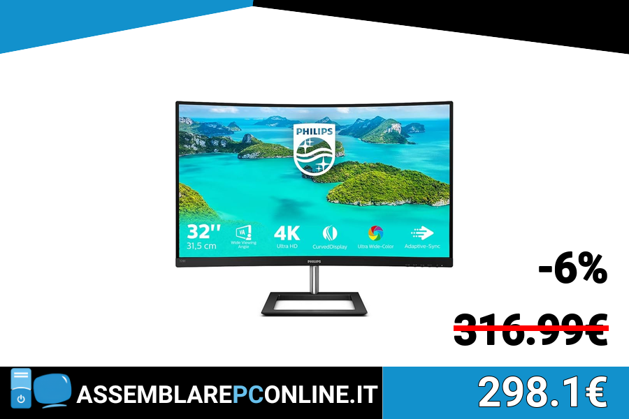 ⭕️Philips 328E1CA Gaming Monitor Curvo con Adaptive-Sync, 32", 4K UHD 3840 x 2160, LED VA, Ultrawide Color, Display Port, 2 HDMI, Speakers Integrati nero