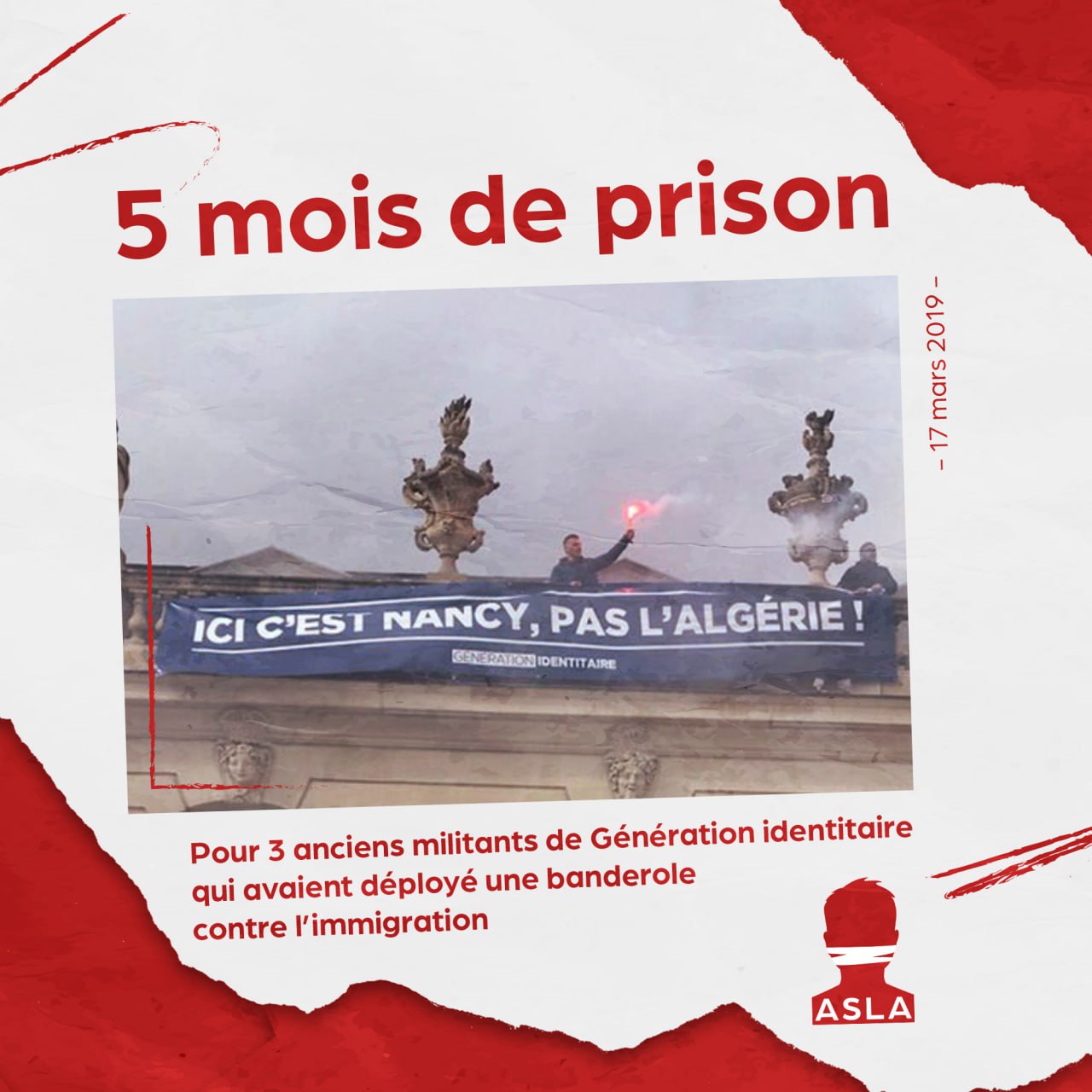 Le 17 mars 2019, Place Stanislas à Nancy, 3 militants identitaires avaient déployé une banderole avec l'inscription "Ici c'est Nancy pas l'Algérie".