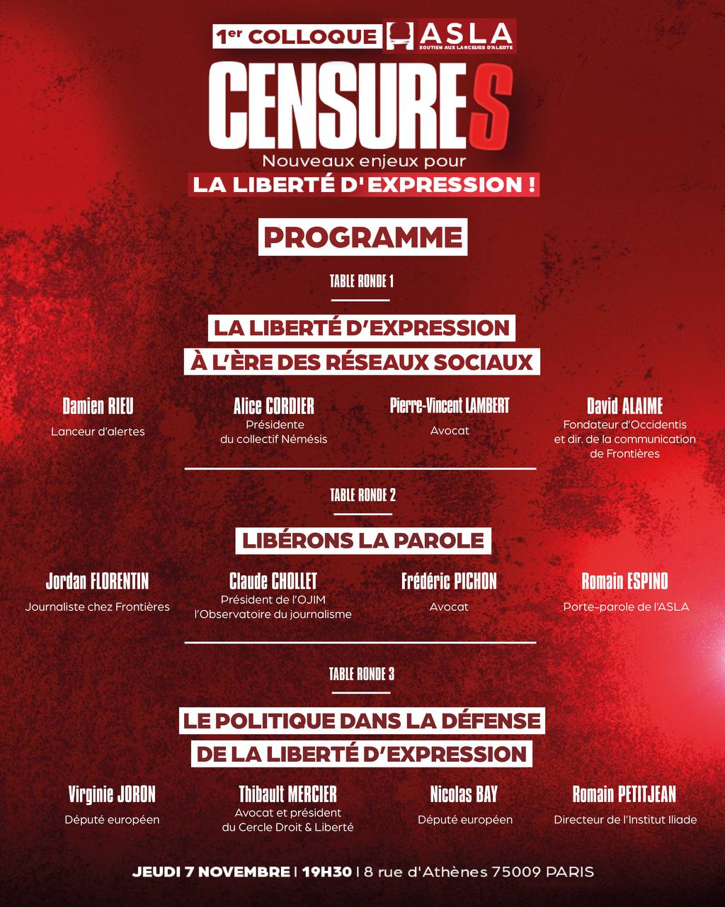 Le 7 novembre prochain, l’ASLA vous invite à un colloque exceptionnel à Paris pour débattre des grands défis actuels liés à la liberté d’expression ! 📢