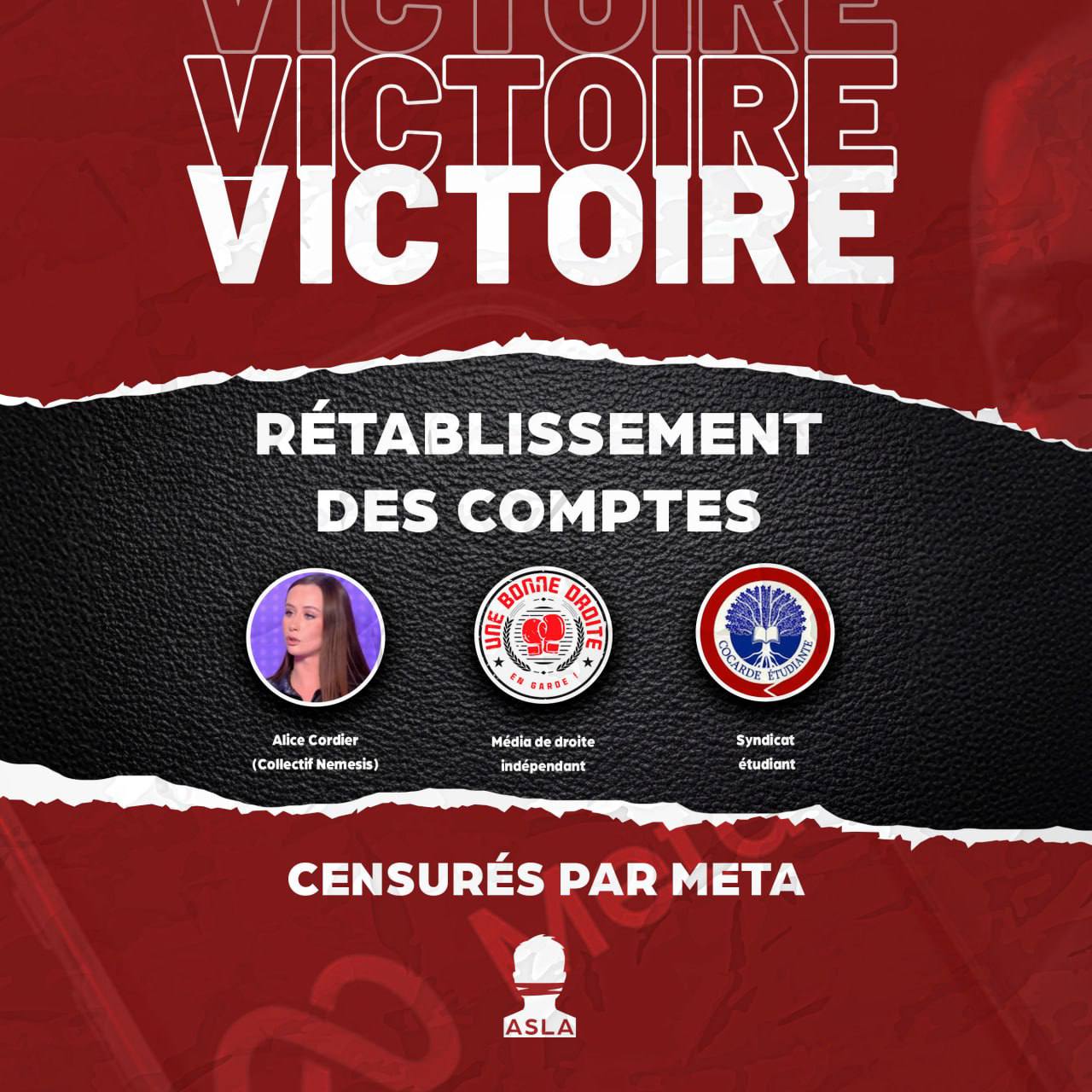 Depuis plusieurs mois, l'ASLA a soutenu juridiquement et financièrement Alice Cordier, directrice du collectif Némésis, le syndicat étudiant La Cocarde et le média Une Bonne Droite dans leur combat contre META, après avoir été victimes de censure idéologique sur Instagram.