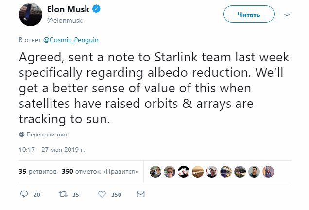 📌 Илон Маск в твиттере в ответ на сообщение одного из пользователей написал, что на прошлой неделе он отправил письмо команде Starlink касательно уменьшения альбедо спутников.