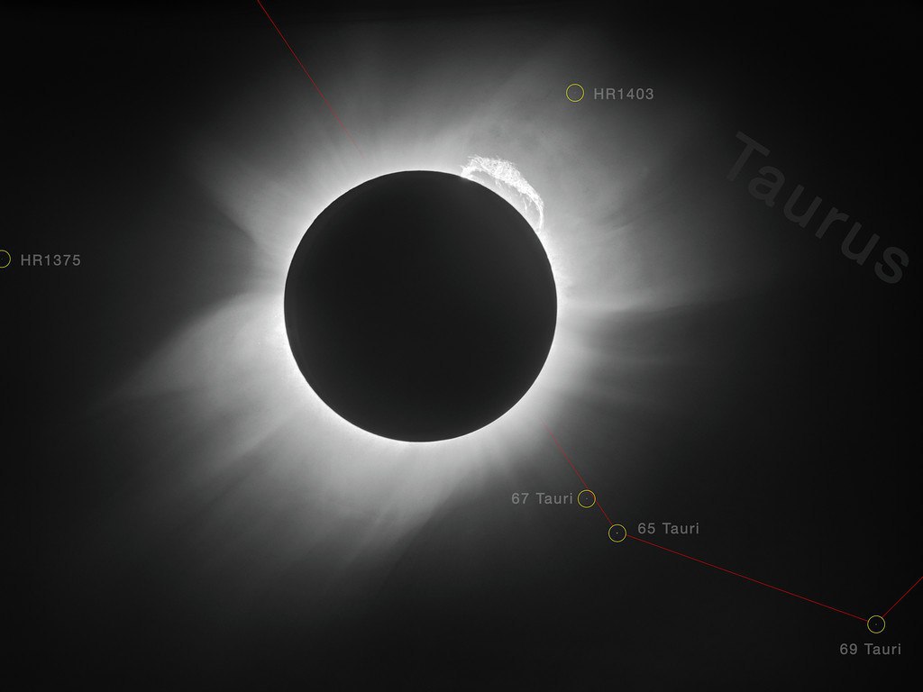 Приведенное фото является, вероятно, рекордным по разрешению из всех астрономических фотографий затмения 1919 года. Оно получено в результате применения к фотокопии исходной фотопластинки (ее неаннотированная версия здесь → http://bit.ly/2RIGCYI) современных методов обработки изображений, в том числе восстановления изображения, подавления шума и удаления артефактов. На фото выявлены великолепные детали солнечной короны, виден гигантский протуберанец, выбрасываемый из верхнего правого края поверхности Солнца, и звезды созвездия Тельца, которые и были использованы для подтверждения предсказаний общей теории относительности.