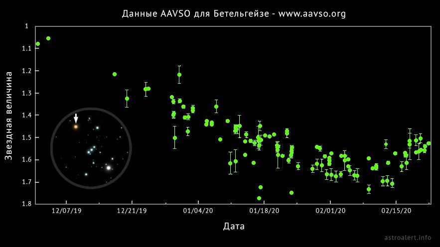 Ослабление блеска звезды Бетельгейзе, начавшееся в середине октября 2019 года, завершилось на отметке около +1,65 зв. вел. в начале текущего месяца!