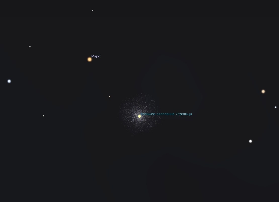 Послезавтра утром Марс (+1,1 зв. вел.) окажется в соединении с ярким шаровым звездным скоплением М22 «Большое скопление Стрельца» (+5,1 зв. вел.). Расстояние между объектами составит около 0,3°.