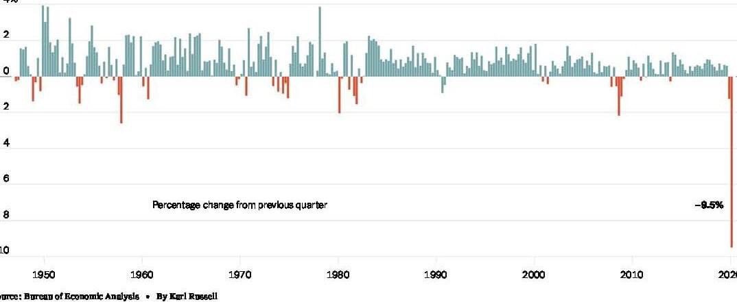 Опубликованы данные о ВВП США во втором квартале и они, в очередной раз, рекордно - на том интервале, на котором собиралась подробная статистика - плохие. Падение за квартал - на 10%, в годовом исчислении (то есть если бы изменения такими темпами продолжались год) - на 30%. Впрочем, оптимист в этом увидит залог рекордных темпов роста в 2021 году - при таком падении просто не может не быть очень быстрого роста в ближайшее время.
