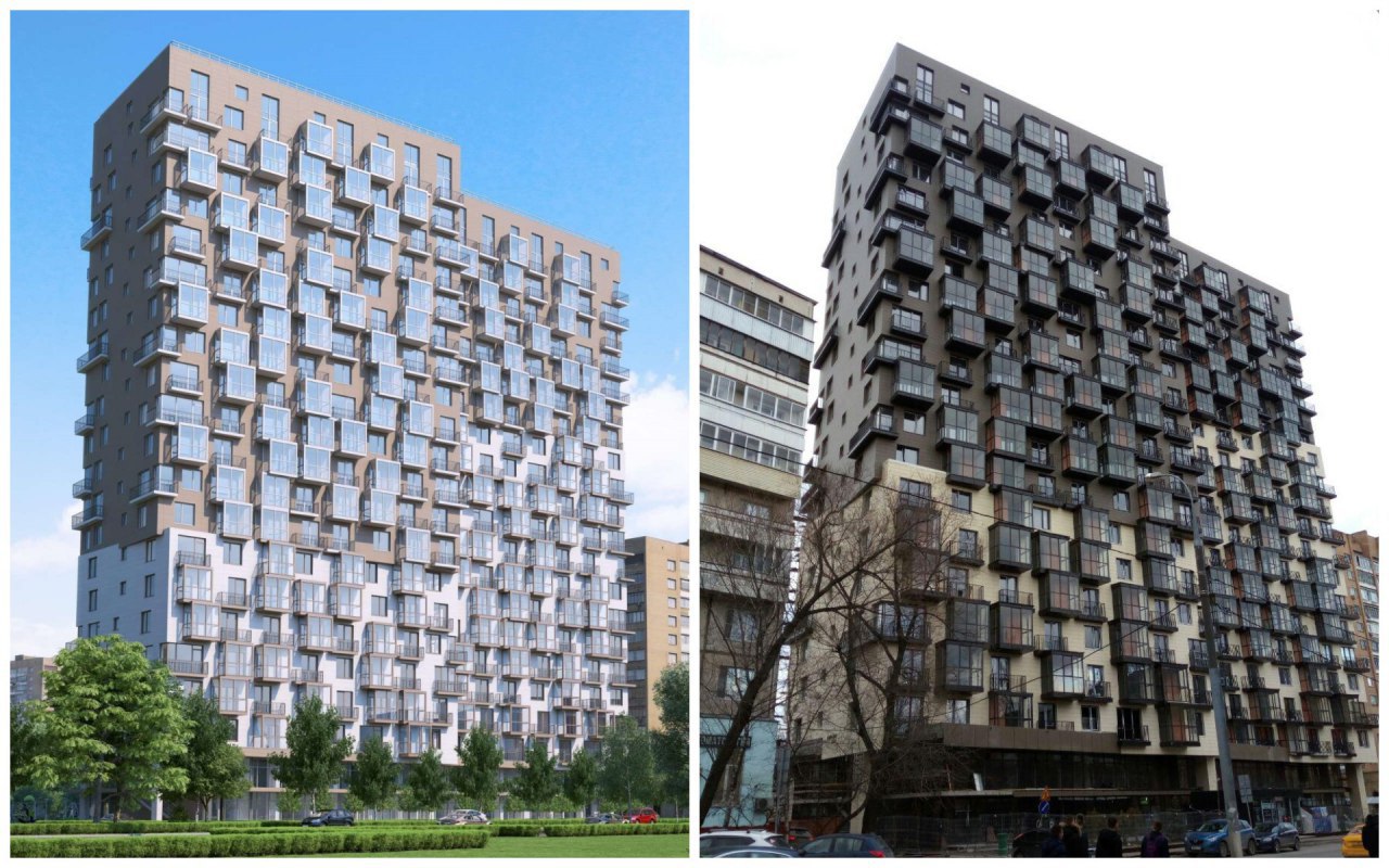 Конечно, на рендерах мы не увидим унылые соседние дома, а вот на реальных фото они очень даже заметны. В остальном всё более-менее совпадает.