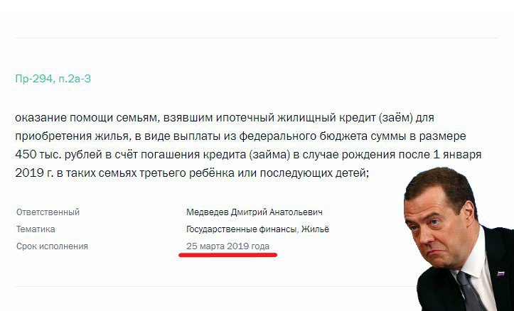 Дмитрий Медведев анонсировал законопроект о разовой выплате 450 тысяч рублей на погашение ипотеки семьям, где родился третий ребенок. Готовый вариант документа должен был оказаться на столе Президента еще 25 марта, но что-то пошло не так.