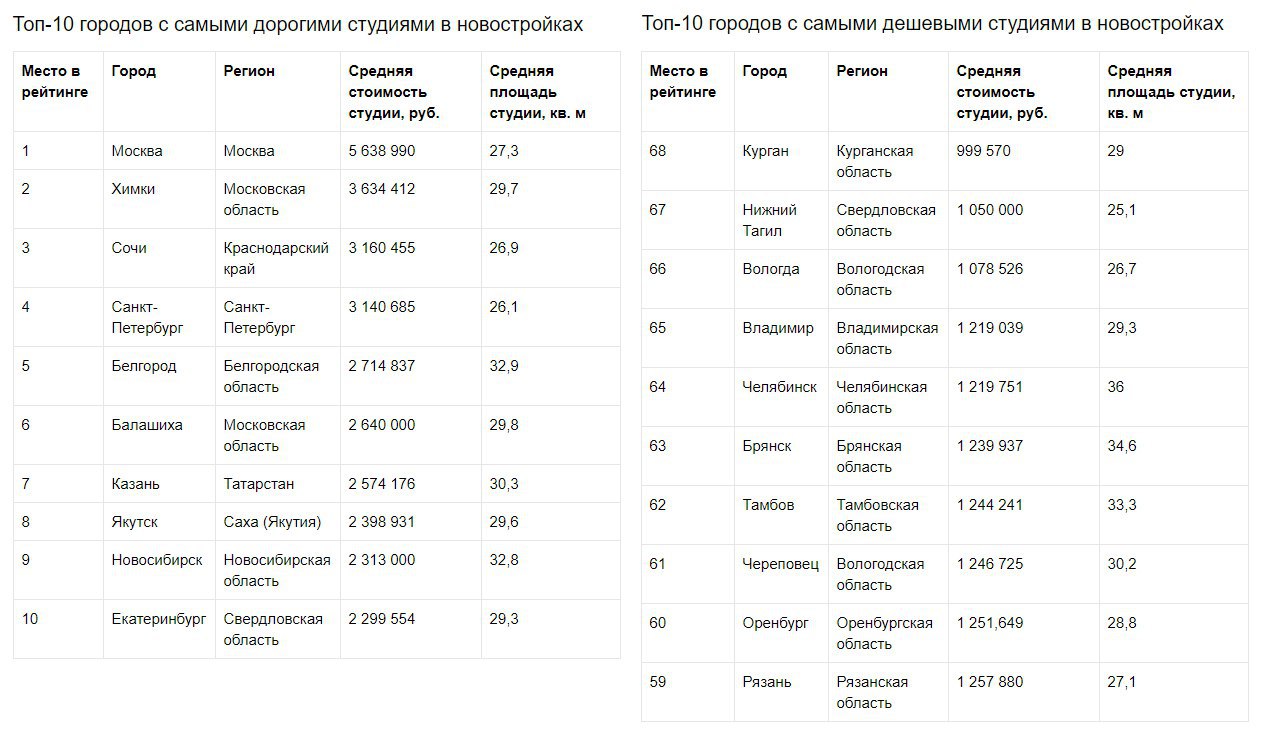Города с самыми дешевыми и дорогими студиями в новостройках