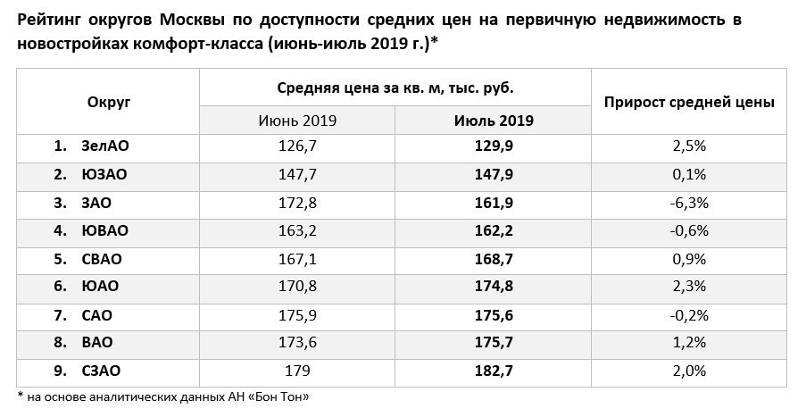 Одним из самых «дешевых» округов неожиданно стал престижный ЗАО. В июле он оказался на третьем месте рейтинга, подвинув ЮВАО на одну строчку вниз по сравнению с предыдущим месяцем.