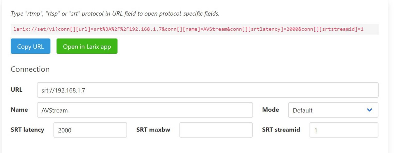 P.S. попробуйте на мобильнике набить строчку: larix://set/v1?connurl=srt%3A%2F%2F192.168.1.7&connname=AVStream&connsrtlatency=2000&connsrtstreamid=1