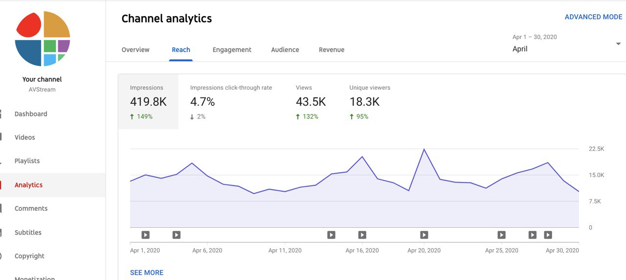 Статистика уютного ютубчика сообщества стримеров AVStream тоже может похвастаться циферками - 43,5к просмотров за апрель, 5к подписчиков на ютубе, и 18к уникальных зрителей за месяц.