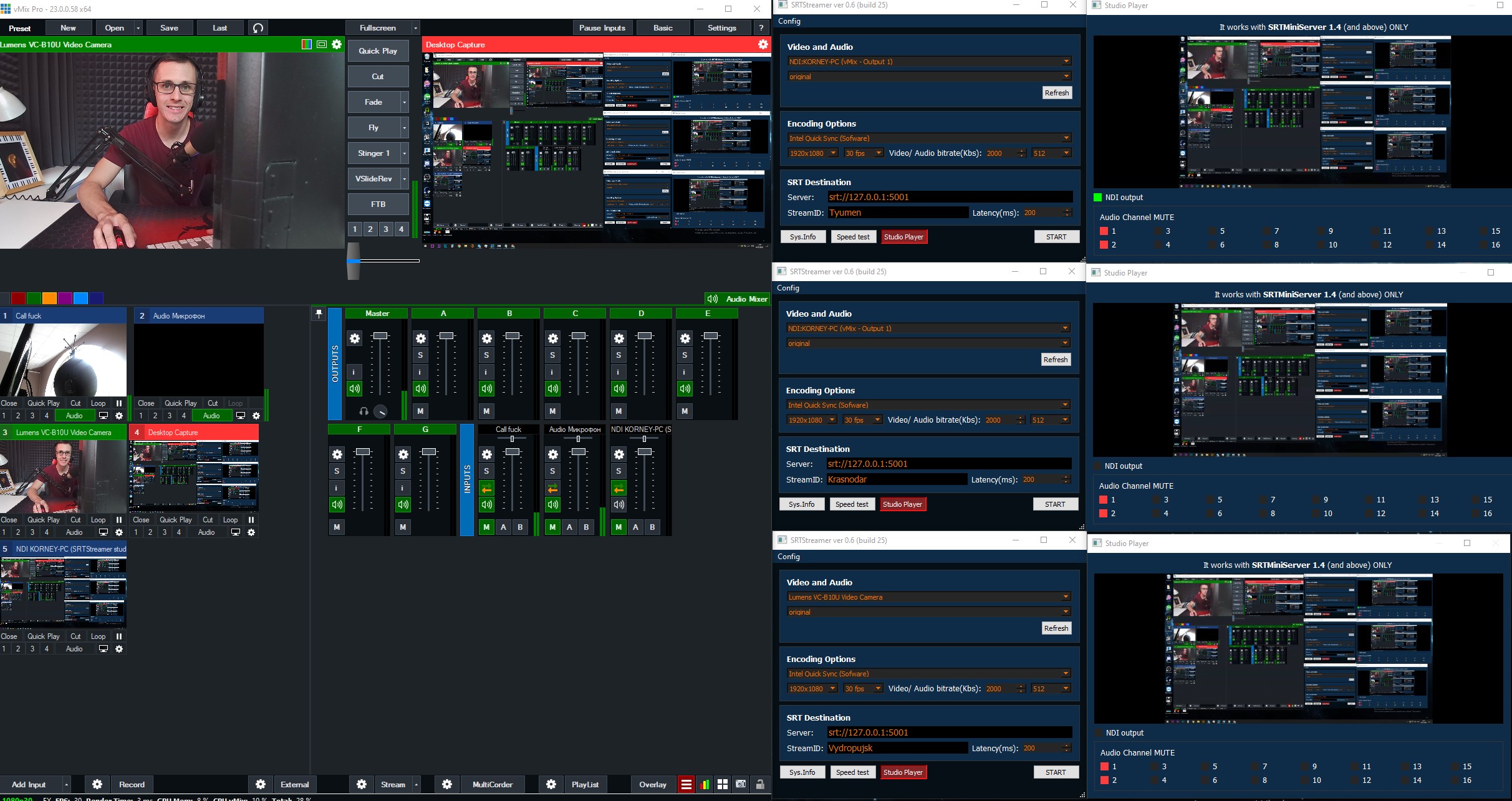 1. Студия стримит мастер картинки. А кто знает IP студии, тот может принимать картинку бесплатным SRTStreamer-ом и либо просто смотреть её, либо преобразовывать в NDI, накладывать свой звук, графику, и стримить дальше, либо выводить на большой экран, плазму, проектор.