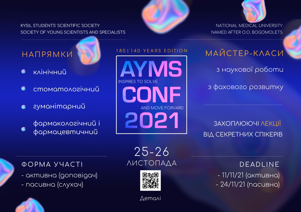 "Annual Young Medical Scientists' Conference (AYMS Conf) - 2021" - це щорічна студентська наукова онлайн-конференція від НМУ ім. О.О. Богомольця, що дає широчезне поле для розвитку🧠