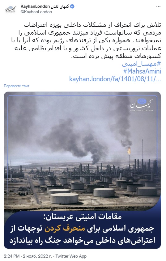 Иранцы, проживающие за пределами своей страны поясняют, что «попытка отвлечься от внутренних проблем, особенно от протестов людей, годами кричащих о том, что они не хотят Исламской Республики, всегда была одной из уловок режима, которая осуществлялась либо террористическими операциями внутри страны, либо военными действия против государств региона» (Twitter онлайн-газеты Kayhan London).