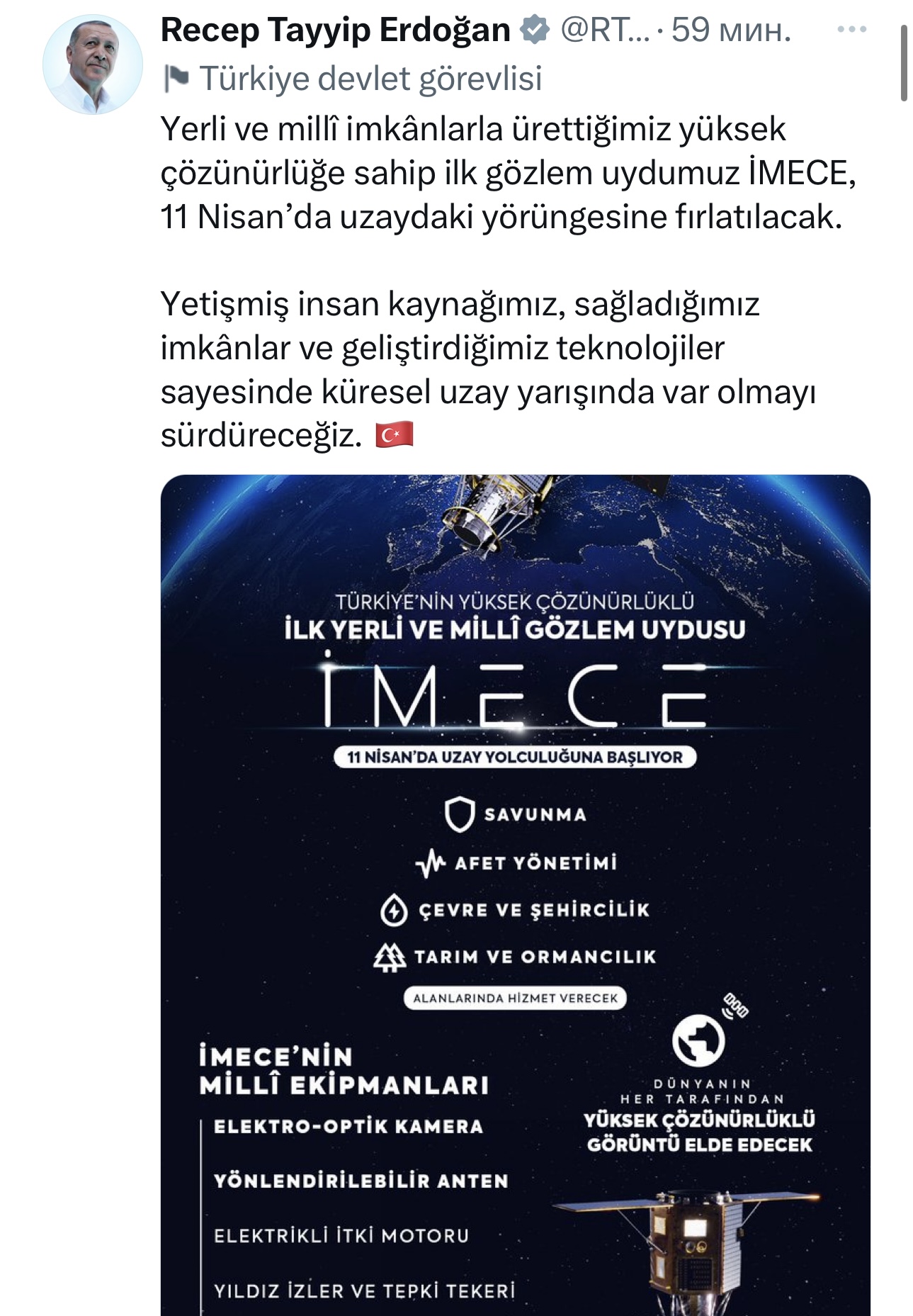 Выступая по этому поводу, президент Эрдоган заявил: «İMECE принесёт нашей стране стратегические возможности, он станет самым передовым спутником наблюдения Земли в Турции с точки зрения разрешения изображения, скорости связи и манёвренности» (турецкое информагентство Anadolu).