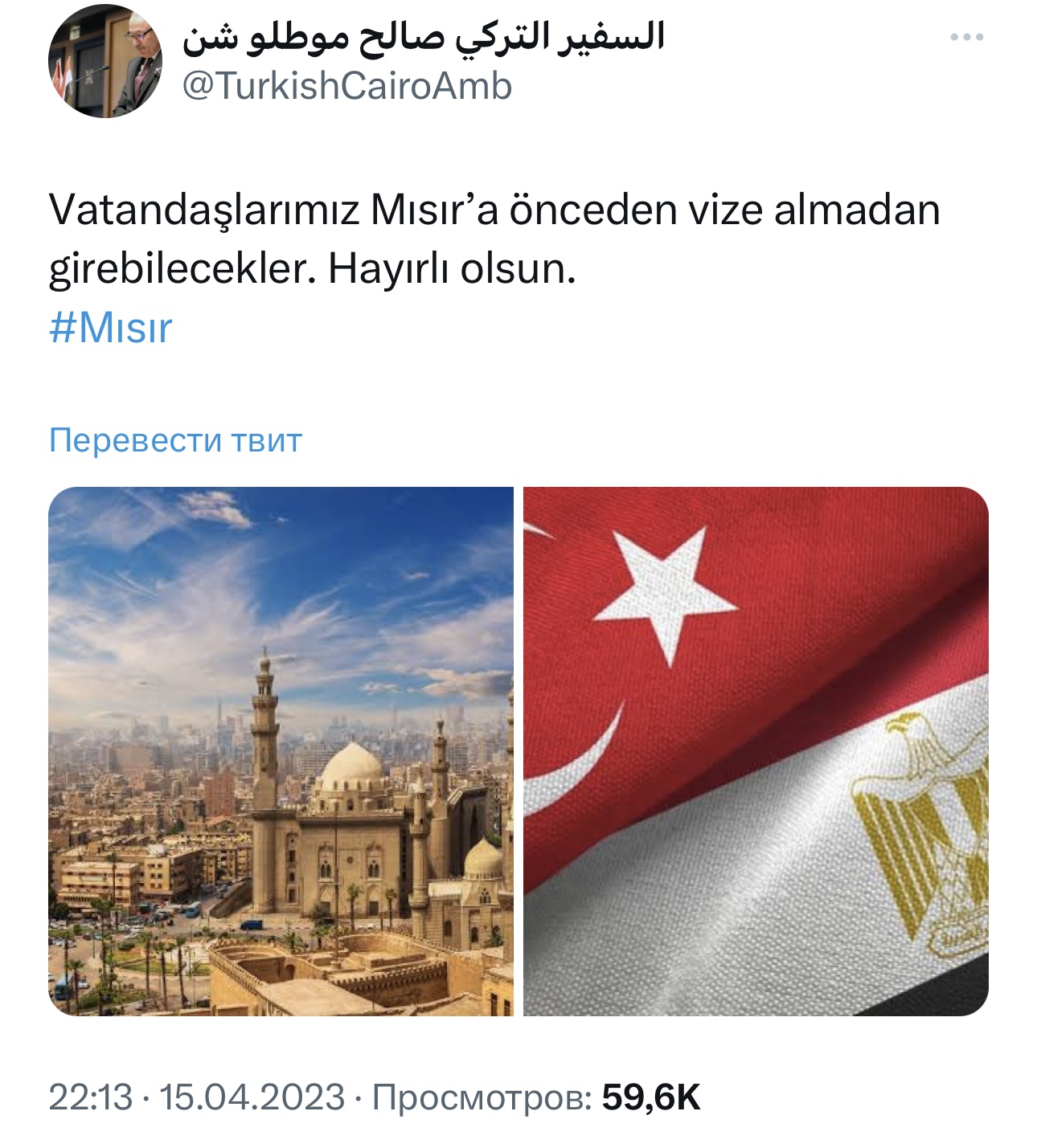 🇹🇷🇪🇬 На фоне нормализации турецко-египетских отношений и новостей о скором открытии посольств, временный поверенный в делах Турции в Каире заявил, что граждане Турции смогут въезжать в Египет без предварительной визы (Twitter-аккаунт поверенного в делах Турции).