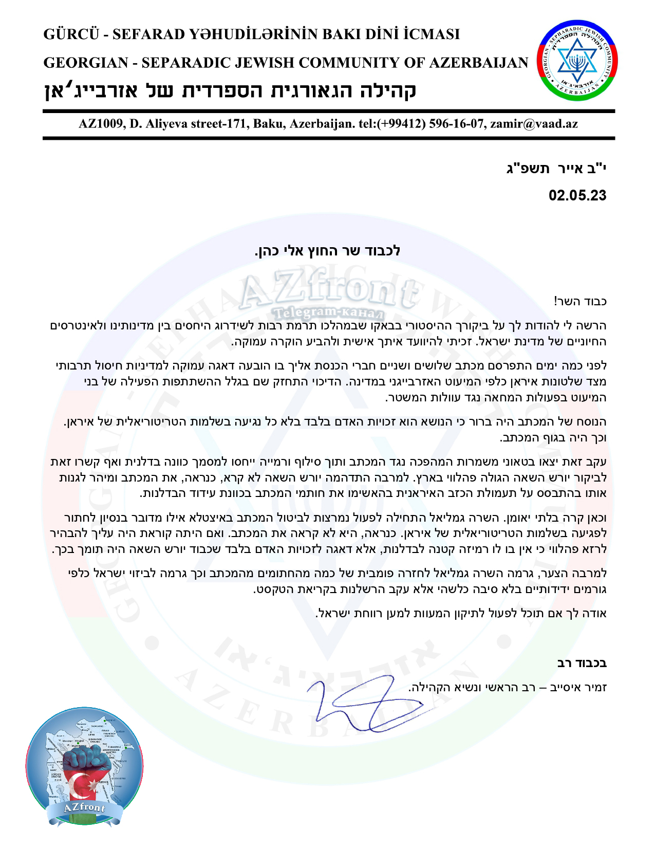 «Несколько дней назад в парламенте было подписано обращение 32 моих друзей, в котором выражалась глубокая обеспокоенность политикой культурного уничтожения со стороны иранских властей по отношению к азербайджанскому меньшинству в стране. Притеснение там усилилось из-за активного участия представителей меньшинства в акциях протеста против режима. Из формулировки письма было ясно, что речь идет о правах человека, а не о территориальной целостности Ирана. Но КСИР выступил против обращения, обманом приписал документу сепаратистские замыслы, и даже связал его с визитом наследника шаха Пехлеви в изгнании в Израиль», - отмечается в письме раввина.