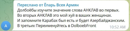 Читатели, отправляющие нам негодующие сообщения по этому поводу, демонстрируют не патриотизм, а собственную безграмотность. Желающим возразить, дескать «анклав» (от фр. "запертый") - это территория одного государства, окруженная территорией другого государства и не имеющая выхода к морю – читайте AZfront двумя глазами. В публикациях на канале слово «анклав» всегда употребляется с прилагательным «сепаратистский».