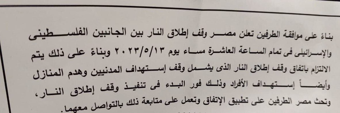 Канцелярия премьер-министра Израиля и объединённый штаб палестинских военно-политических организаций в секторе Газа официально объявили о прекращении огня. Военные действия продолжались с 9 мая.